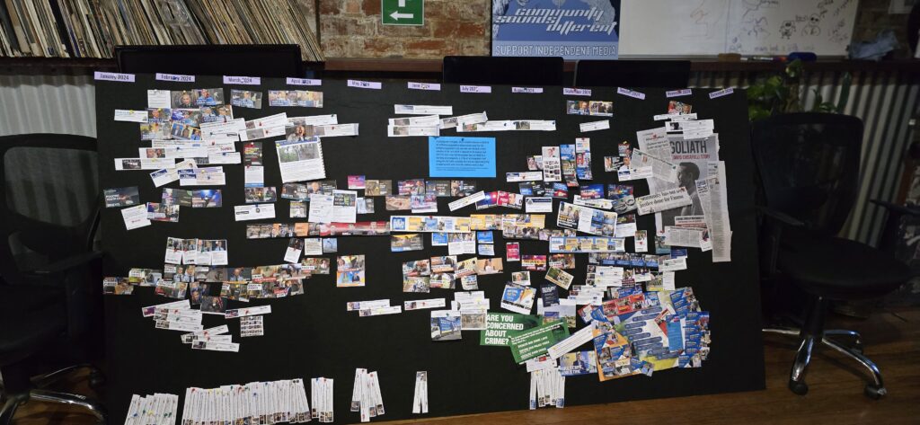 A collage of 2024 articles on a 2.2m pin board timeline, this collaborative art piece was made and displayed at Banshees from Nov 2024 to Jan 2025.