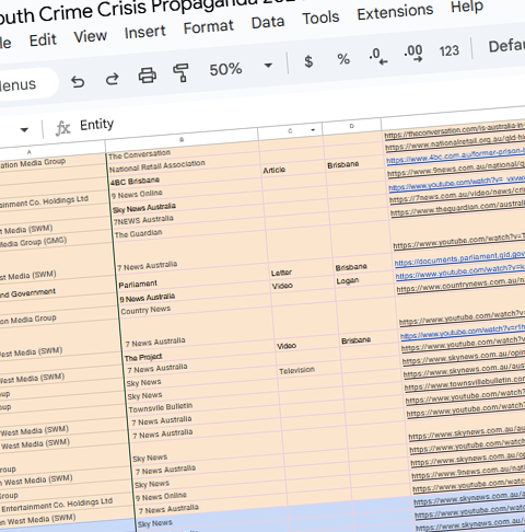 I’ve been reviewing articles that use the moral panic campaign term ‘youth crime crisis’ since 2022, collecting them in a spreadsheet and presenting the data in a variety of ways to show how children are used to justify funding for prison businesses, surveillance businesses and police.